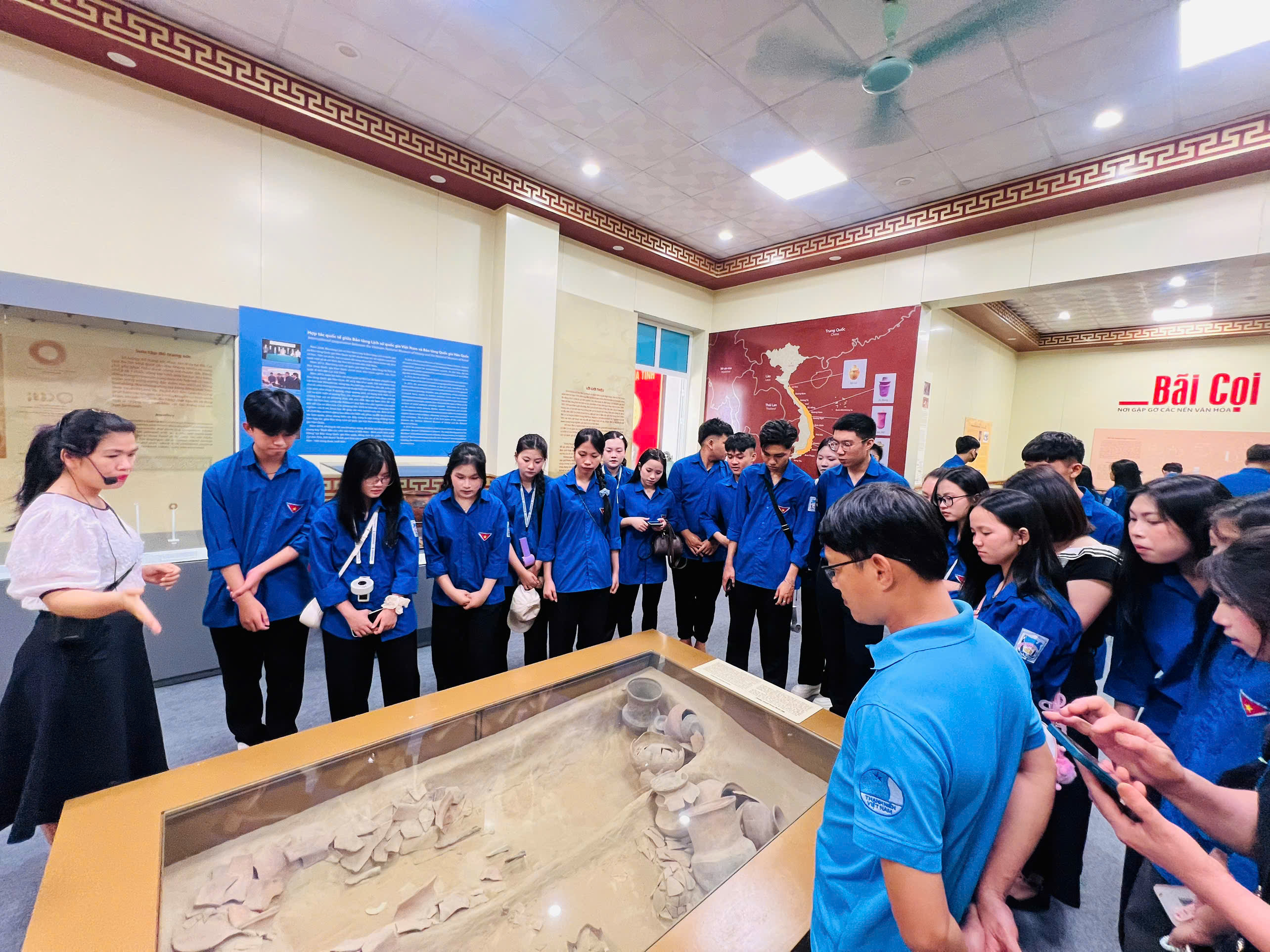 Ngay từ những bước chân đầu tiên, không gian trưng bày đã mở ra trước mắt các em học sinh một lát cắt sống động của lịch sử tiền – sơ sử vùng đất Hà Tĩnh. Dưới sự hướng dẫn tận tình của thuyết minh viên, đoàn học sinh được dẫn dắt qua từng lớp trầm tích văn hóa, nơi Bãi Cọi hiện lên không chỉ là một di chỉ khảo cổ học, mà còn là điểm hội tụ độc đáo giữa các nền văn hóa Đông Sơn, Sa Huỳnh và cả những dấu ấn giao thoa khu vực.