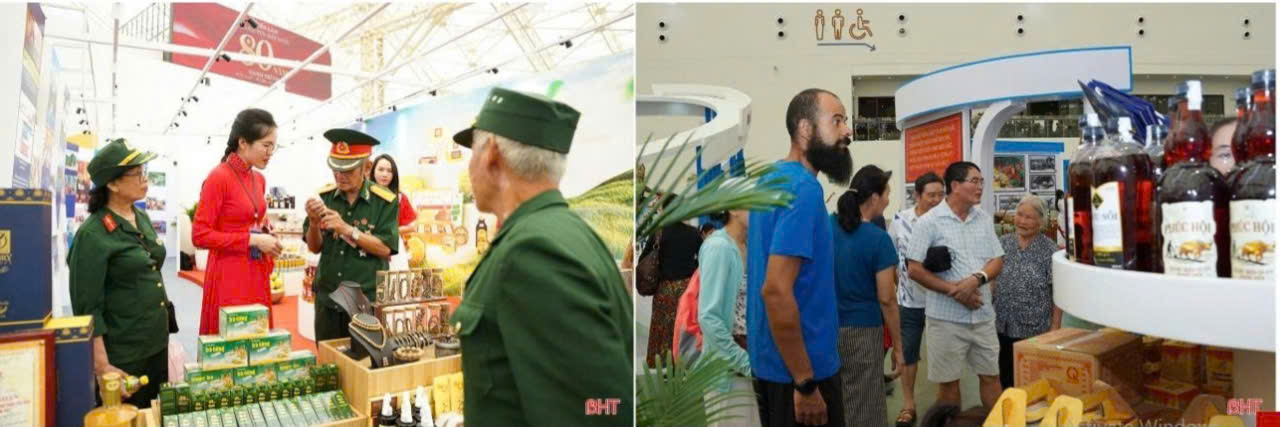 Một trong những điểm nhấn thú vị của gian hàng Hà Tĩnh tại triển lãm là khu vực trưng bày, giới thiệu các sản phẩm OCOP, đặc sản của Hà Tĩnh như: Trầm hương Tâm Thiên Hương, cu đơ Thư Viện, Phong Nga, các sản phẩm nhung hươu Hương Sơn...