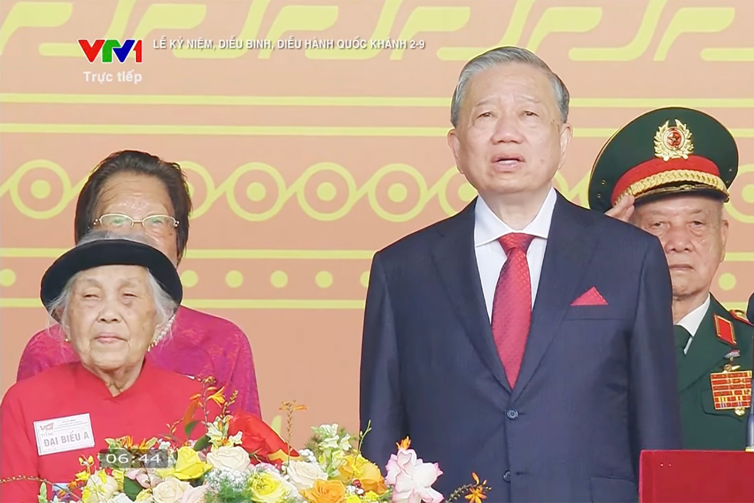 Mẹ Việt Nam Anh hùng Trần Thị Huyến ngồi bên cạnh Tổng Bí thư Tô Lâm tại buổi lễ diễu binh, diễu hành kỷ niệm 80 năm Cách mạng Tháng Tám thành công và Quốc khánh nước Cộng hòa Xã hội chủ nghĩa Việt Nam diễn ra vào sáng 2/9. (Ảnh: Nguồn VTV).