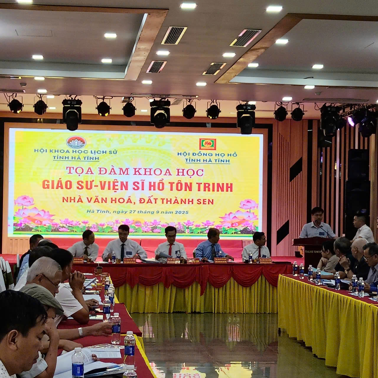 Sáng ngày 27/9/2025, tại Khách sạn Sailing Tower (phường Thành Sen, tỉnh Hà Tĩnh), Hội Khoa học Lịch sử tỉnh Hà Tĩnh phối hợp với Hội đồng họ Hồ tỉnh Hà Tĩnh tổ chức Tọa đàm khoa học với chủ đề “GS - VS Hồ Tôn Trinh, nhà văn hóa đất Thành Sen”.